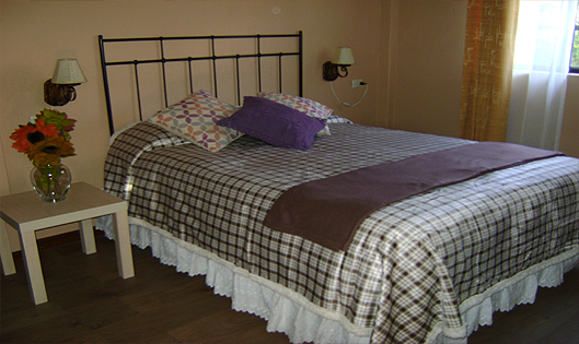 El baño amplio y luminoso, con ducha y agua caliente (terma solar) donde se ofrece accesorios de higiene personal. Una habitación con cama matrimonial, ventana grande al jardín, armario amplio. Entrada y salida a los jardines.