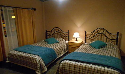 El baño amplio y luminoso, con ducha y agua caliente (terma solar) donde encontrara accesorios de higiene personal. Una habitación con dos camas individuales, ventana grande, armario amplio. Entrada y salida a los jardines.